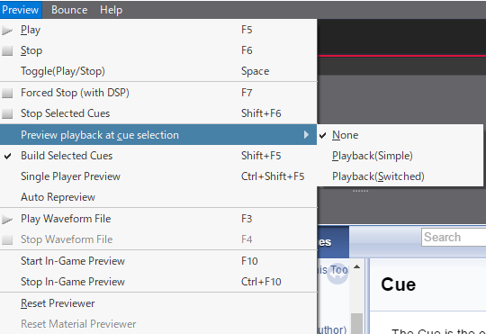| 选择Cue时播放 | 指定在树状列表选择Cue时是否播放。 无选择: 不播放 播放: 播放 切换播放: 停止正在播放的Cue后播放 |